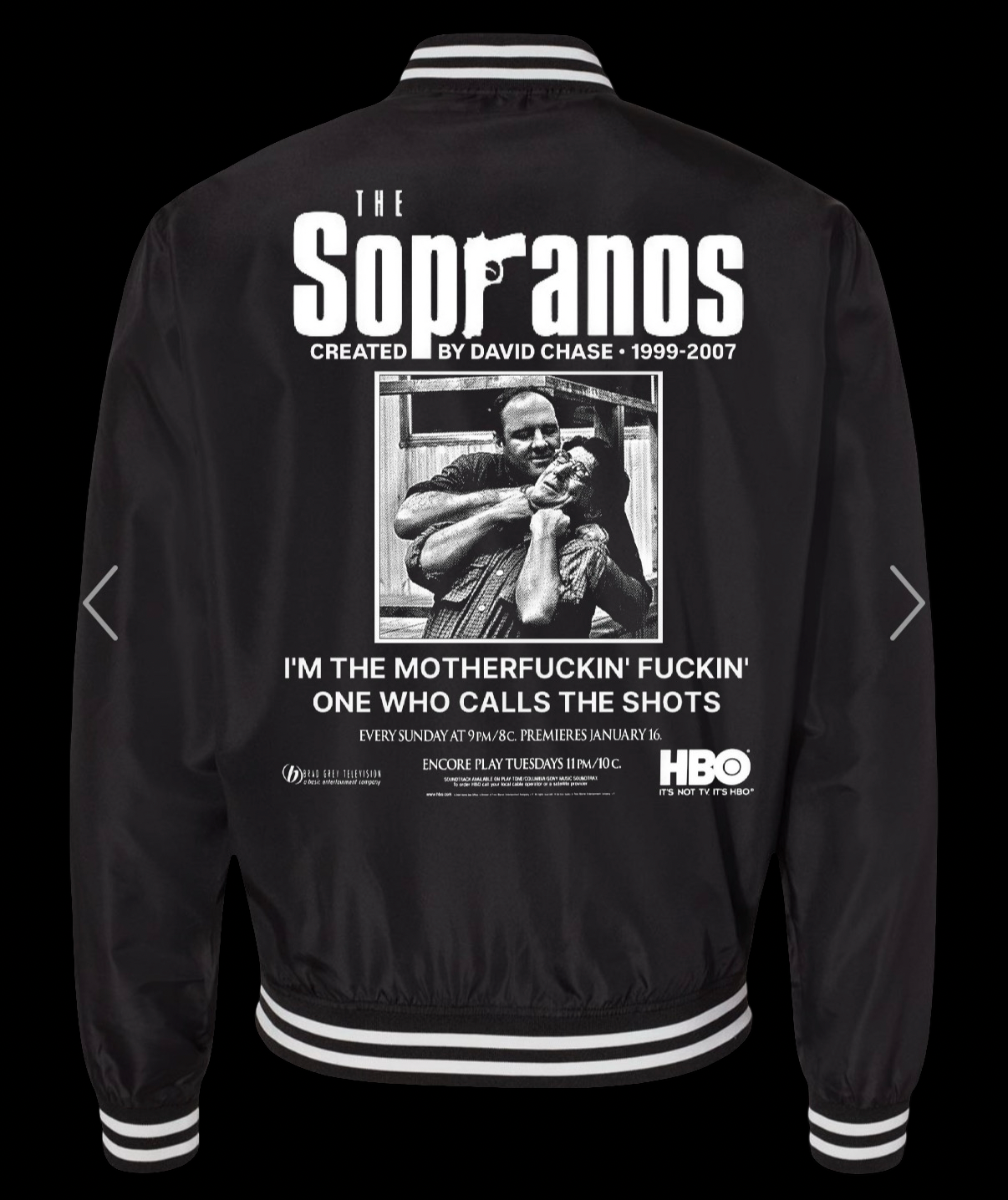 Shop › *PREORDER* Sopranos Bomber Jacket Image 1 of 2 Image 2 of 2 *PREORDER* Sopranos Bomber Jacket $80.00 Shaka Wear Bomber Jacket Size: Small Medium Large XL 2XL 3XL Add To Cart Added! Shaka Wear Bomber Jacket
